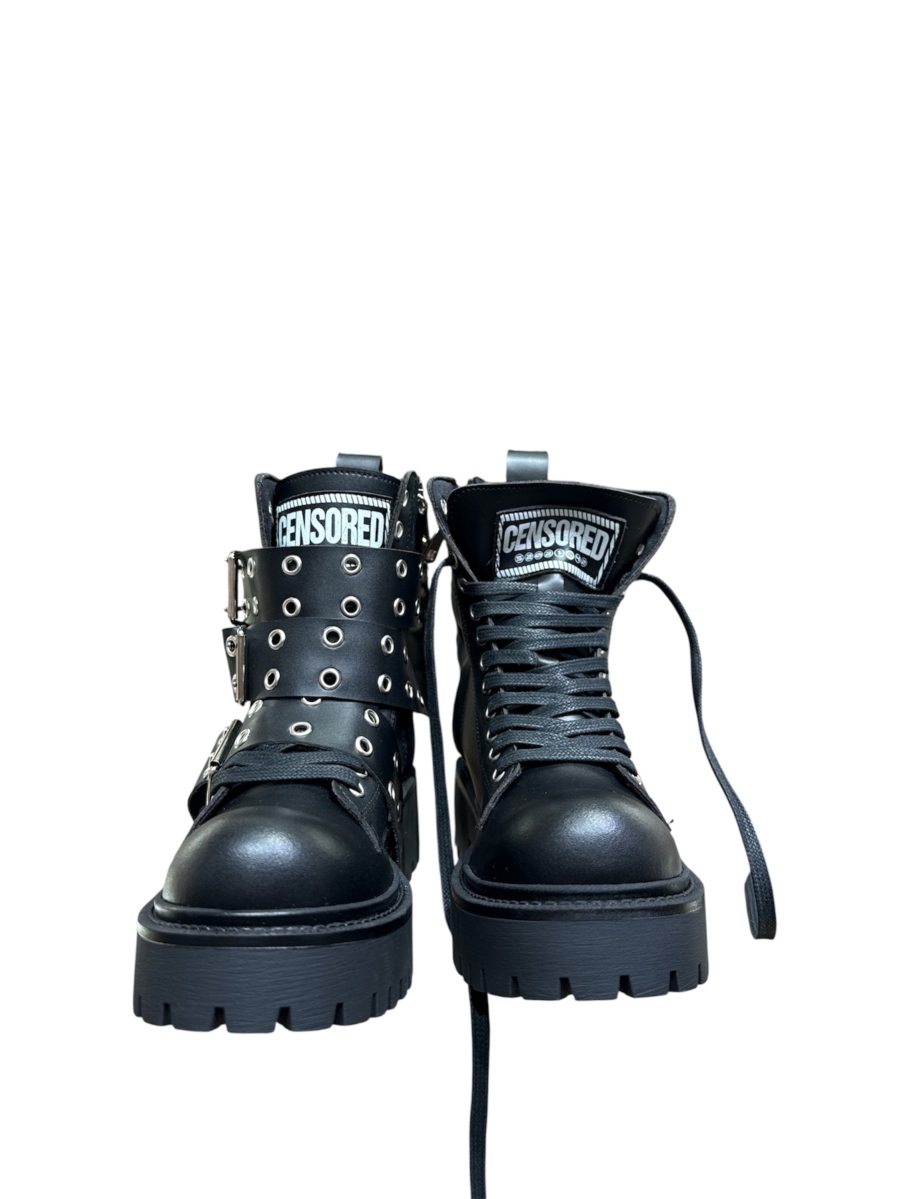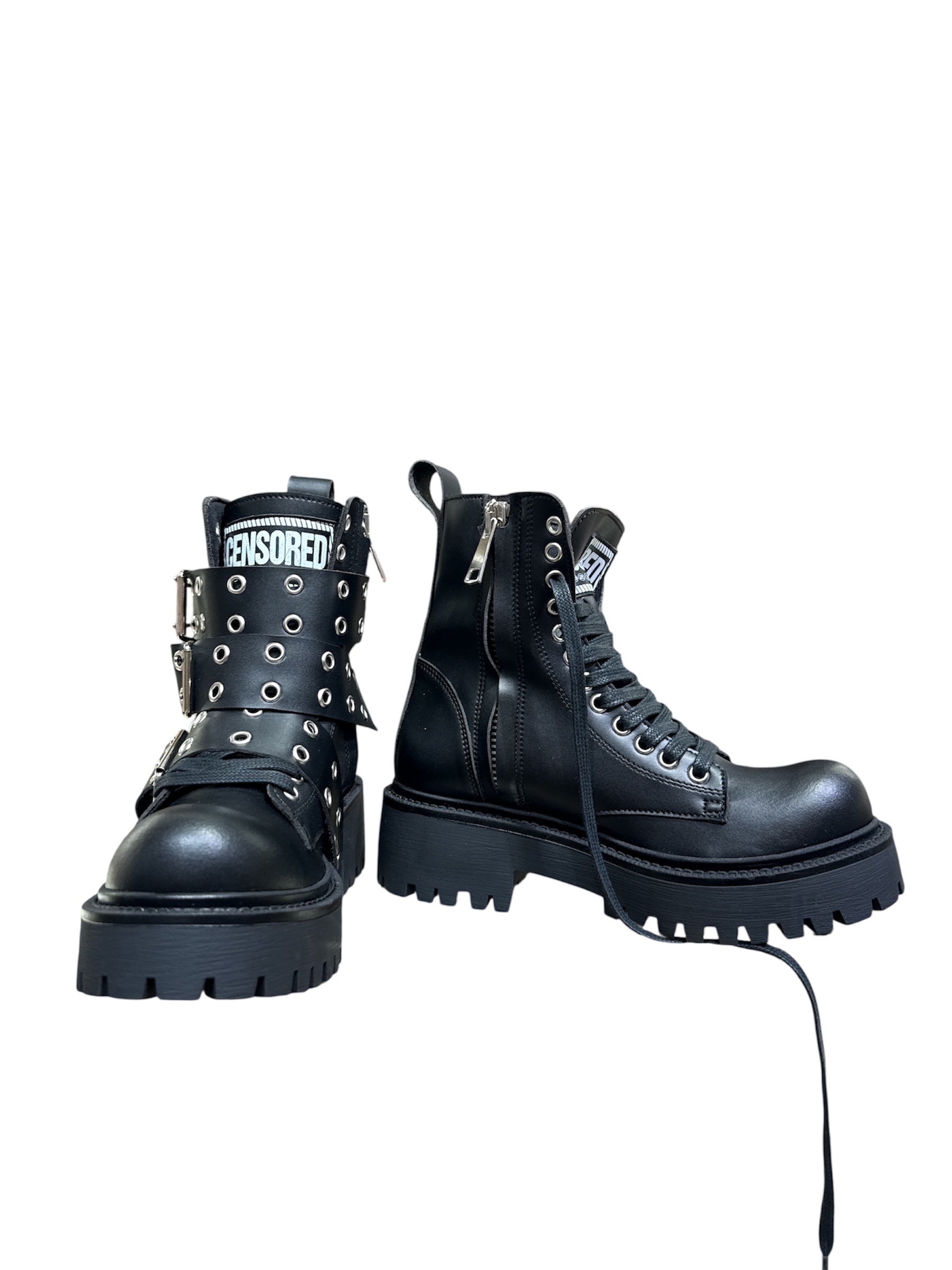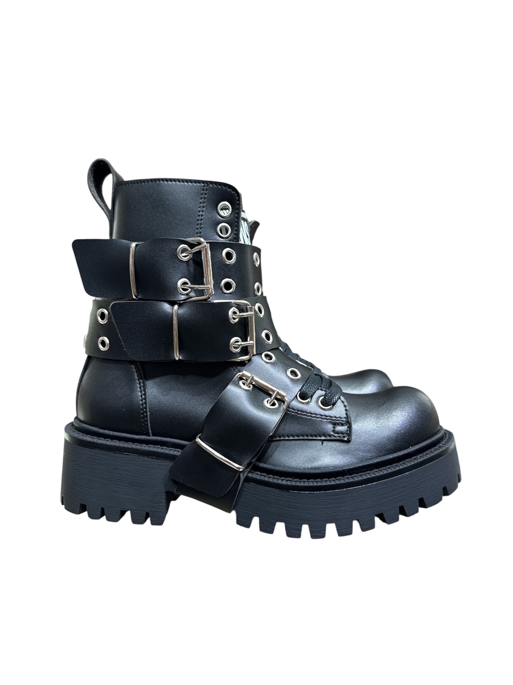 Anfibio elegante realizzato in pelle nera con dettagli di cinture che conferiscono un carattere deciso e raffinato. La para di 5 cm garantisce comfort e stabilità durante la giornata, sollevando leggermente il piede dal terreno. Perfetto per chi ricerca uno stivale versatile che unisce stile contemporaneo e praticità, adatto sia a look casual che più formali. Una scelta sofisticata per completare il vostro guardaroba con personalità.