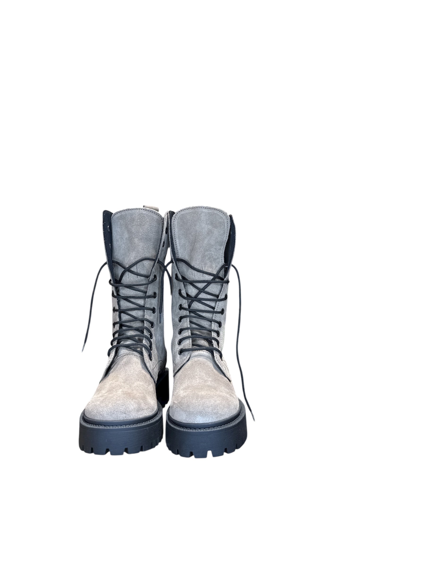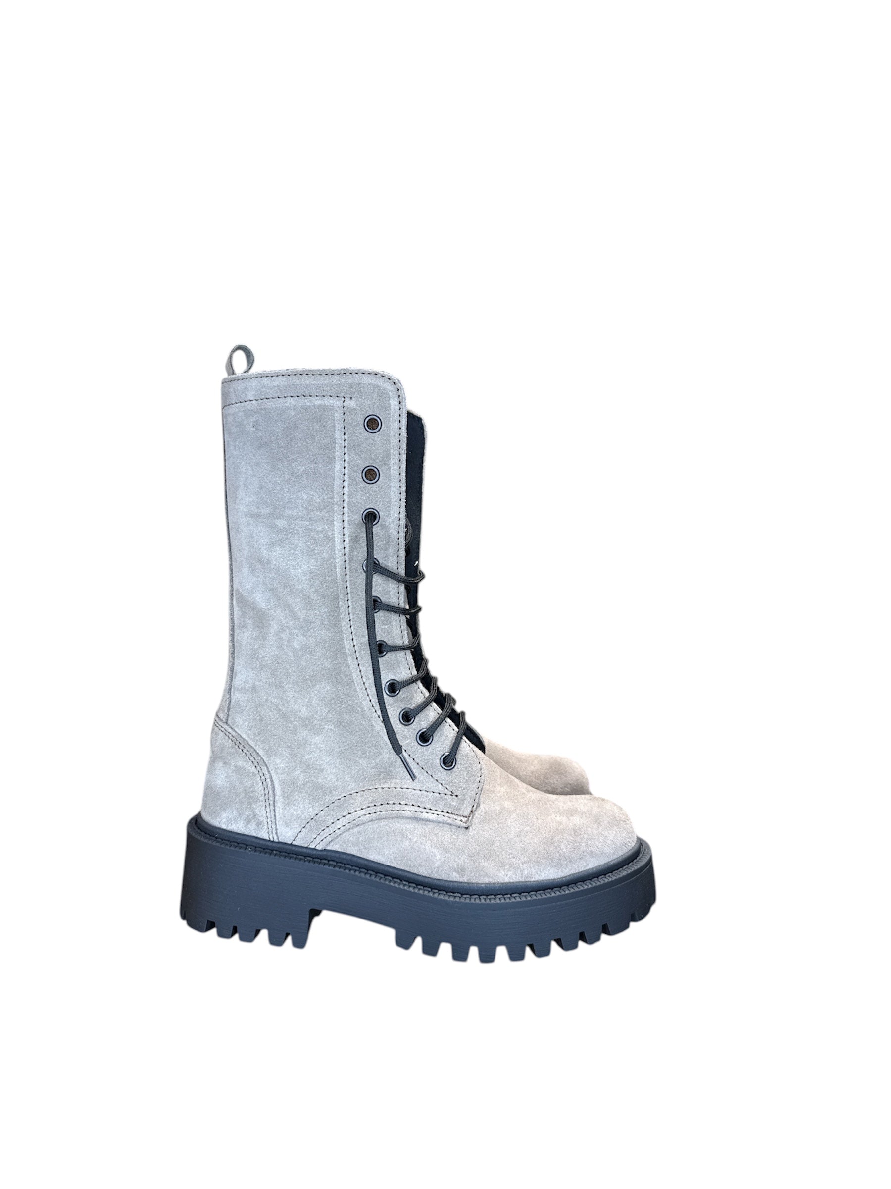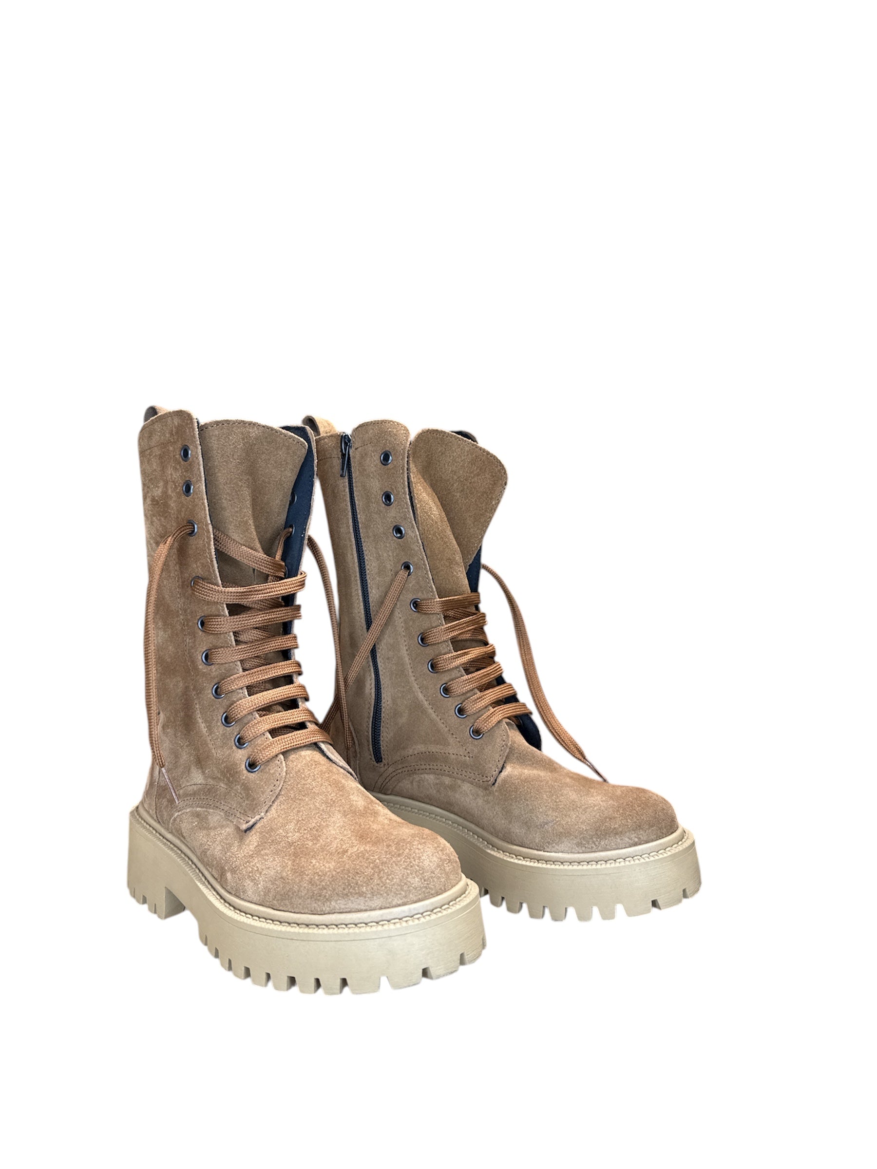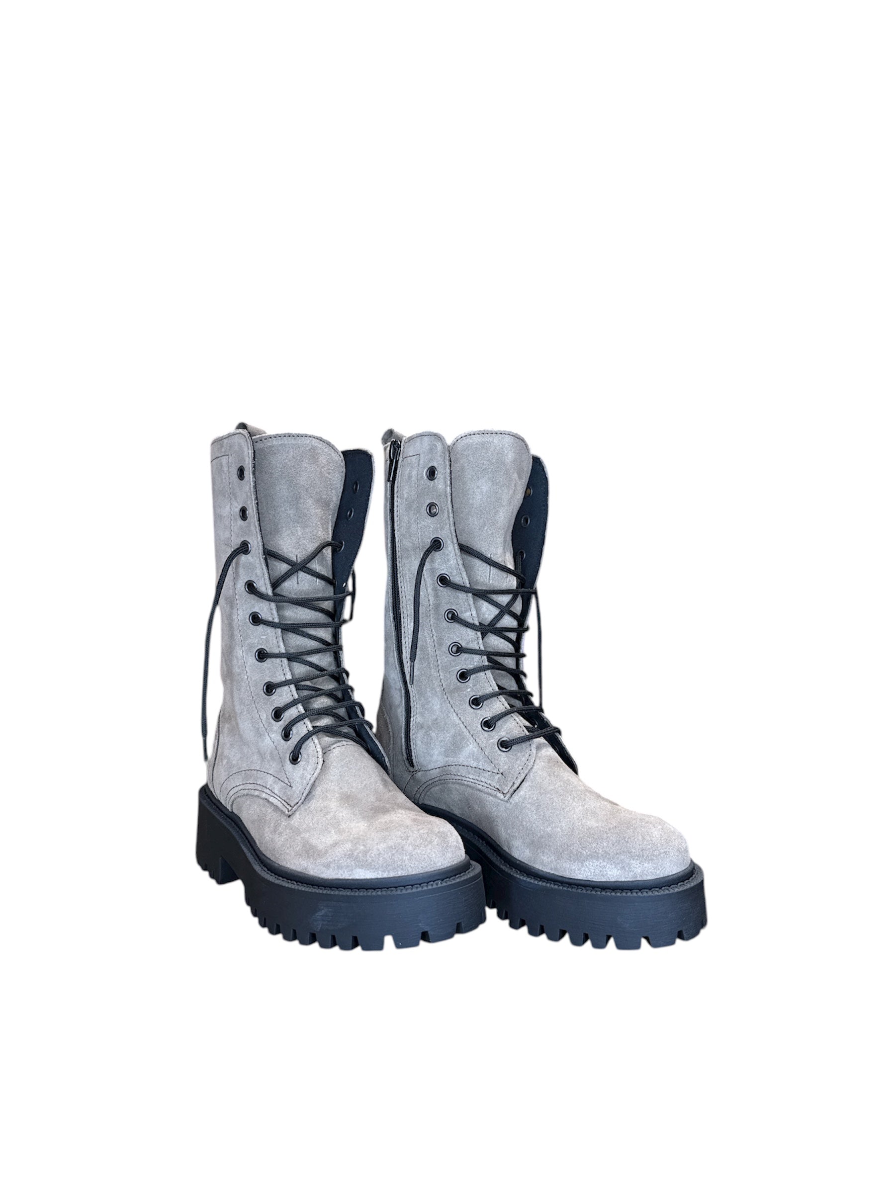 Stivali modello anfibio in camoscio. Lacci e zip interno gamba. Fondo in gomma