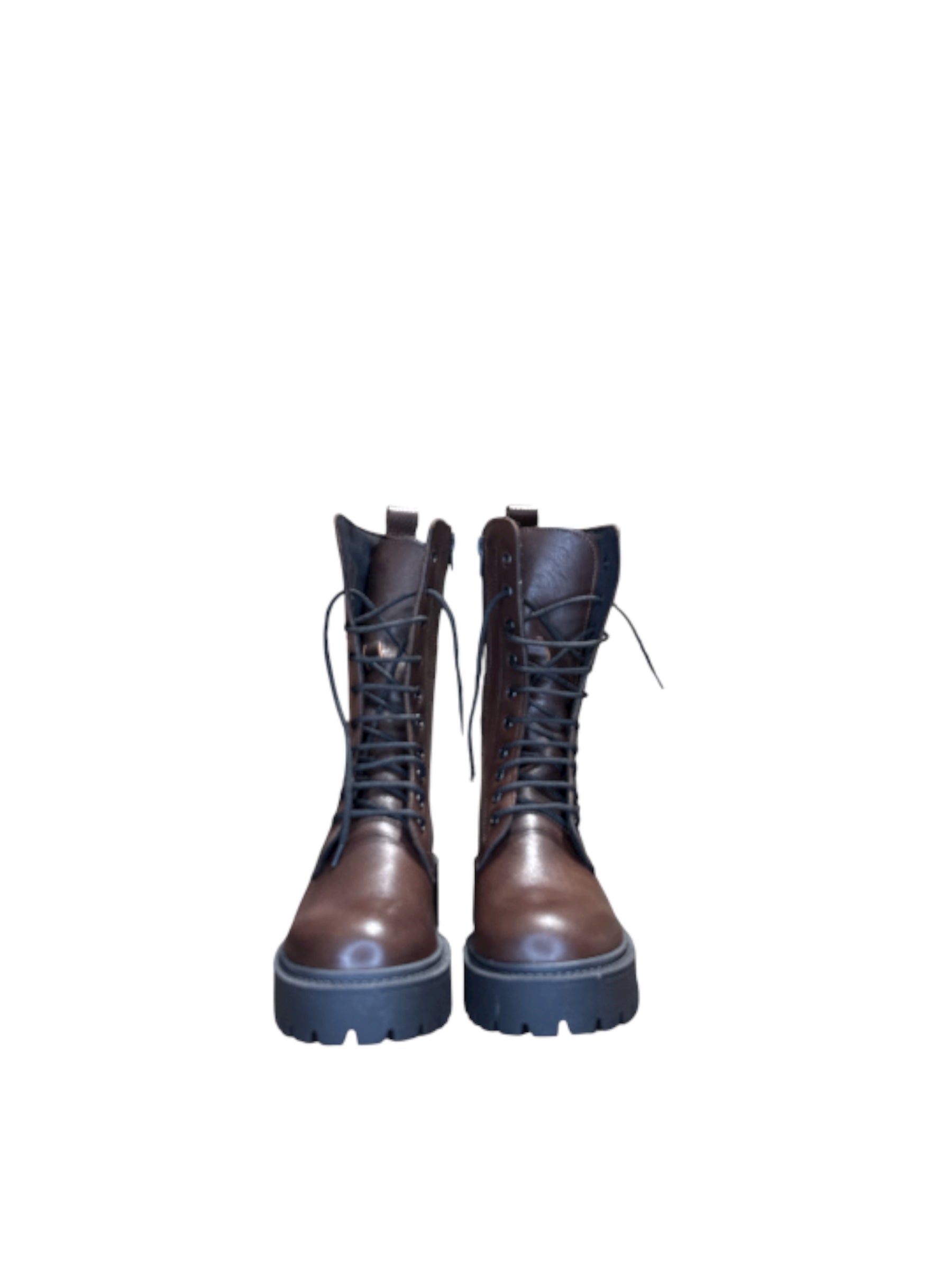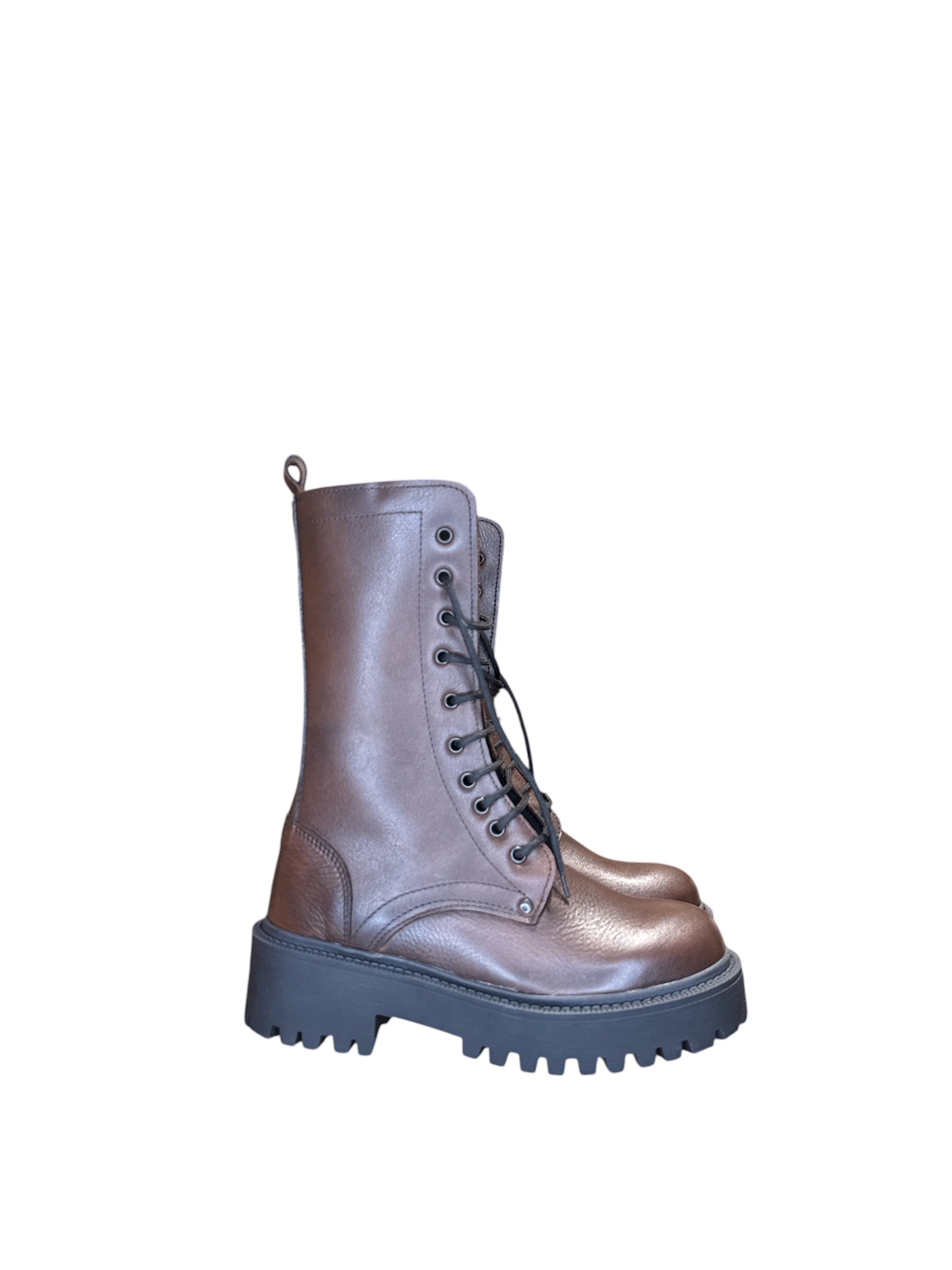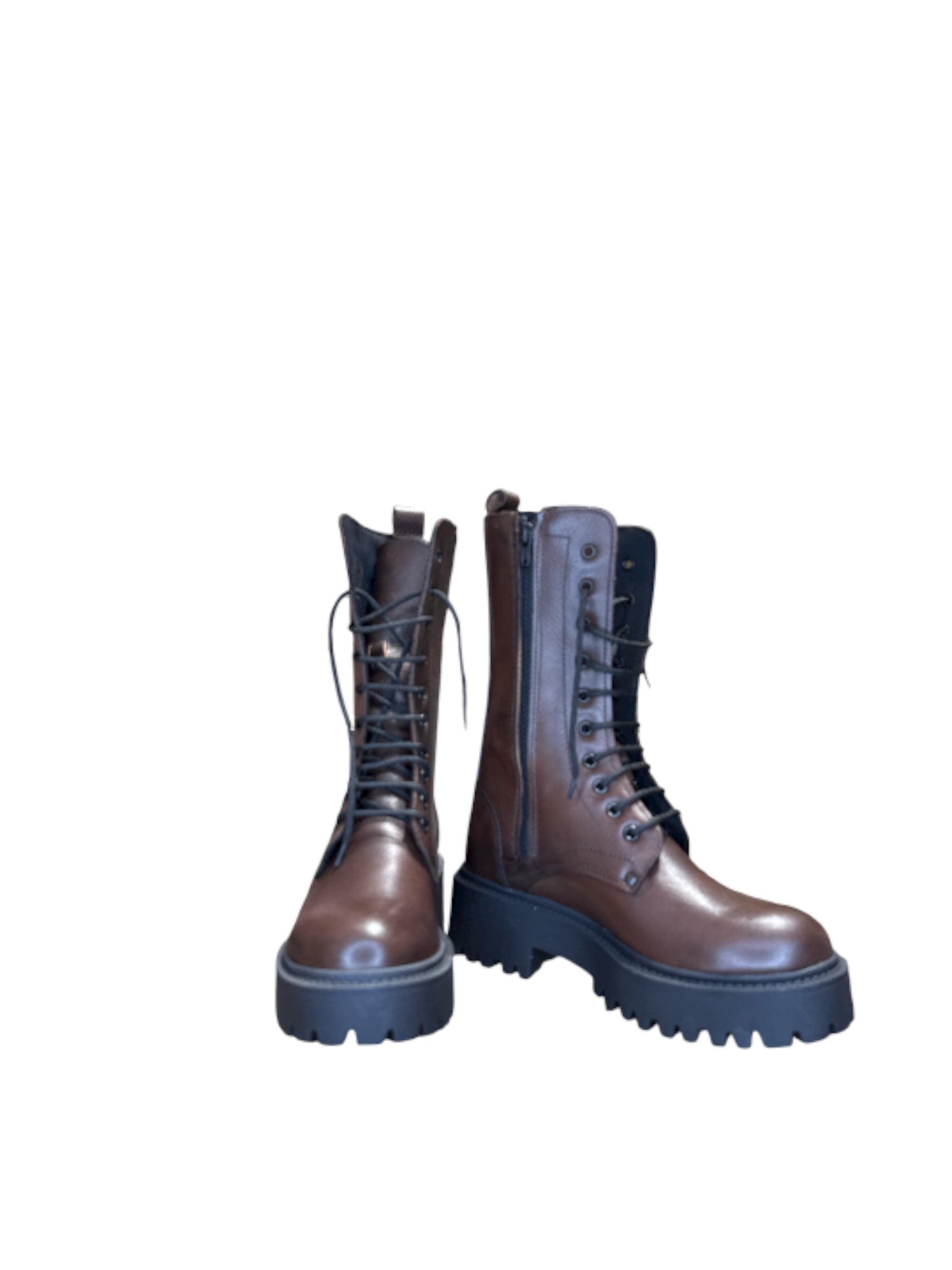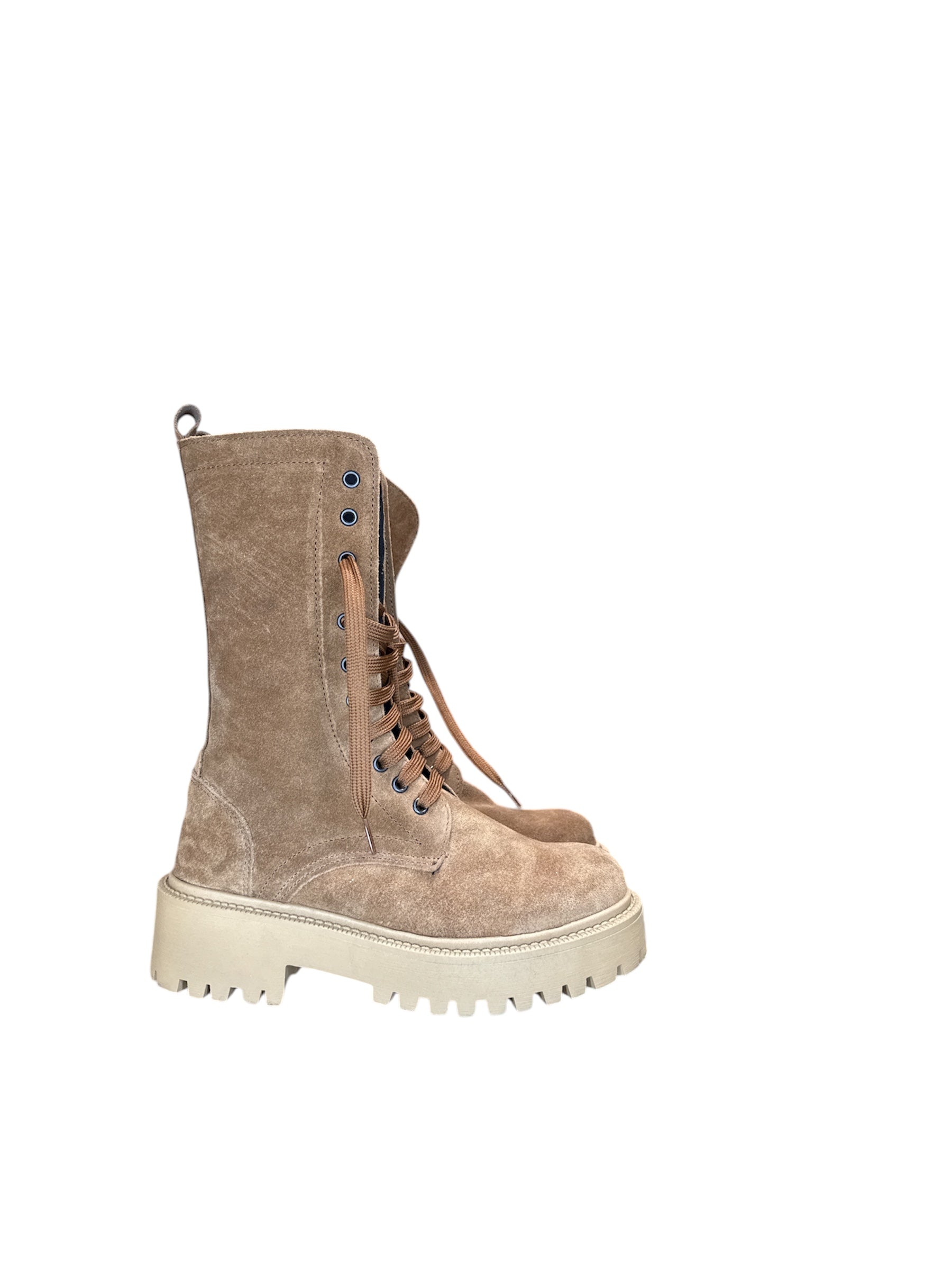 Stivali modello anfibio in camoscio. Lacci e zip interno gamba. Fondo in gomma