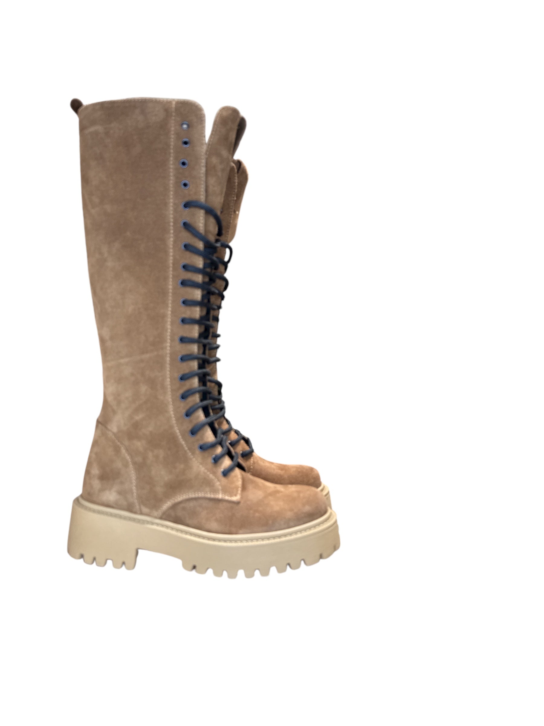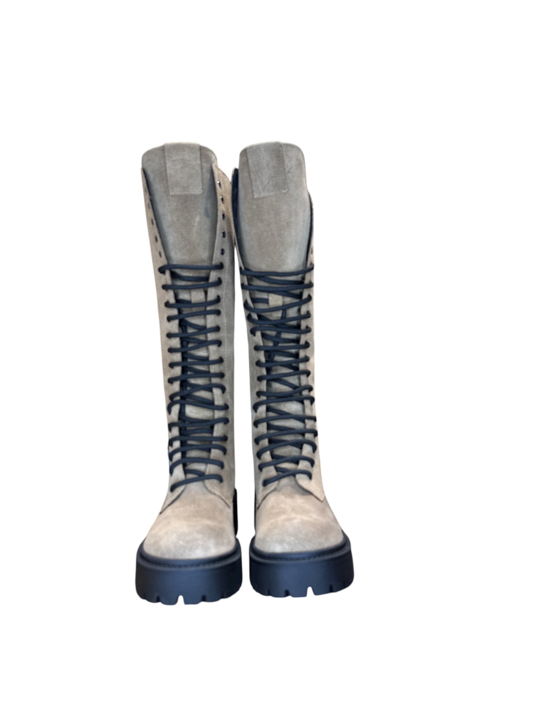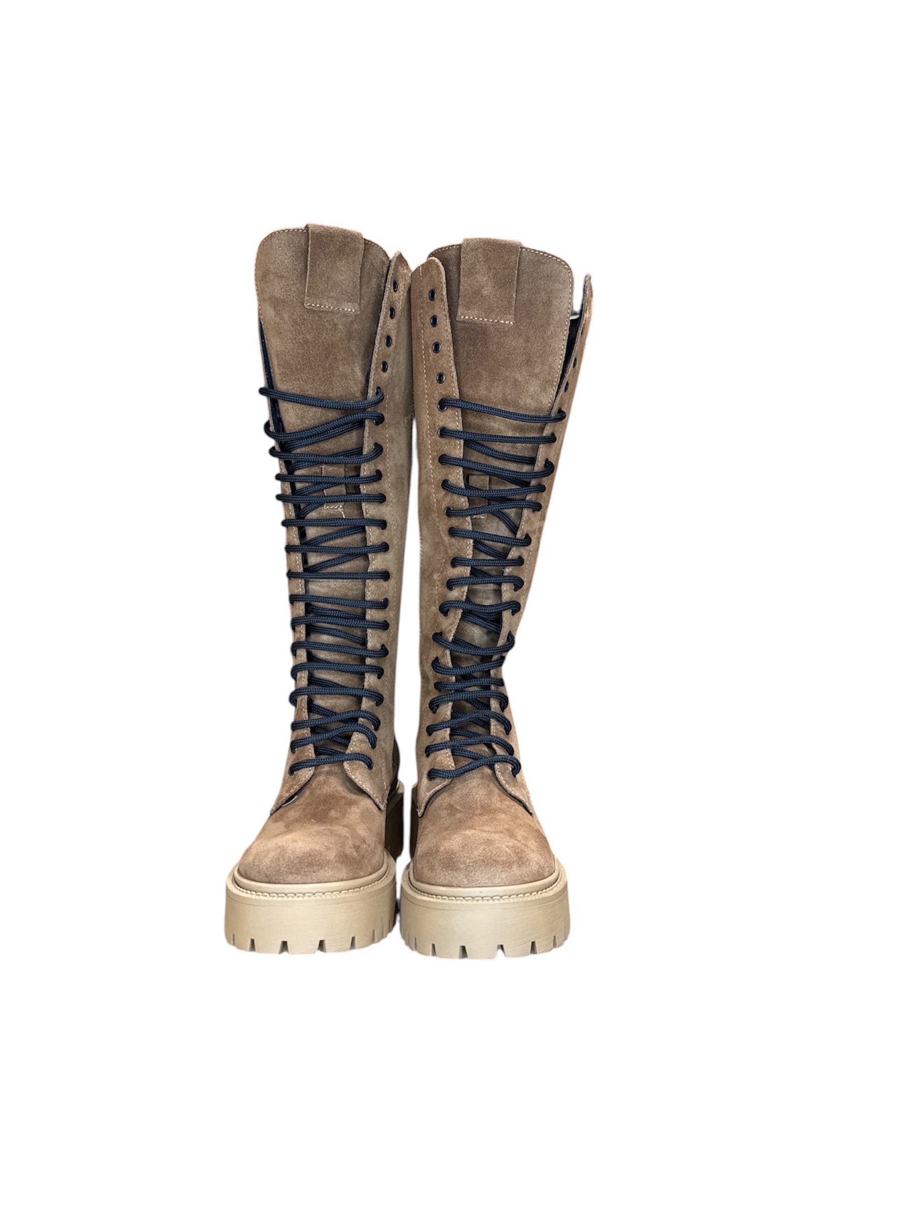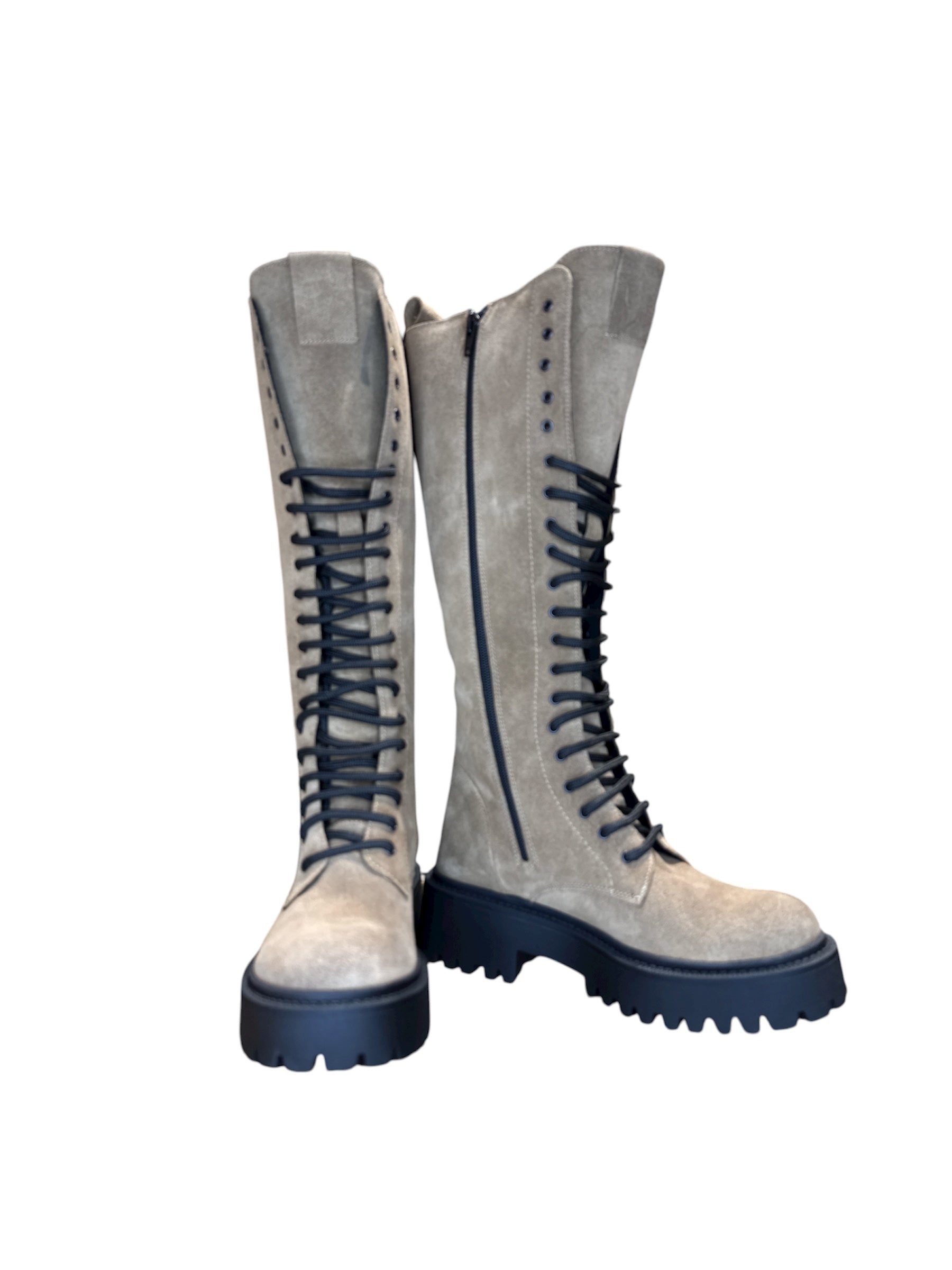 Stivali in camoscio . Altezza ginocchio. Lacci e zip interno gamba. Fondo in gomma