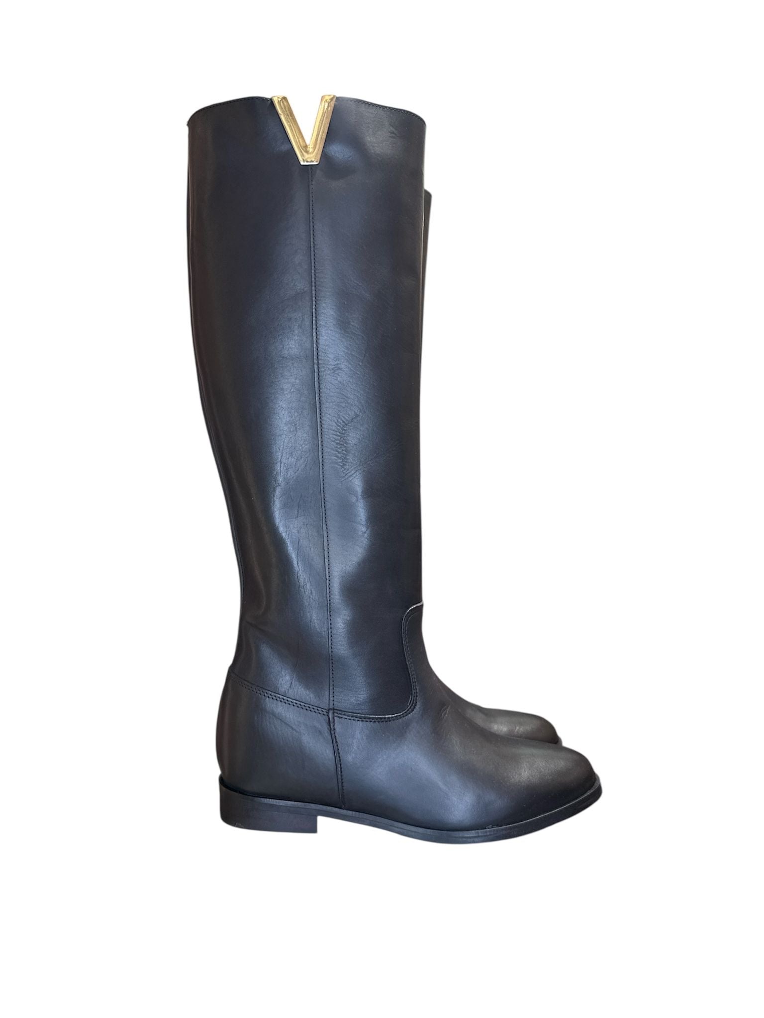 Stivali in pelle nero. Dettaglio V in oro. Modello tubolare. Rialzo interno di circa 5cm