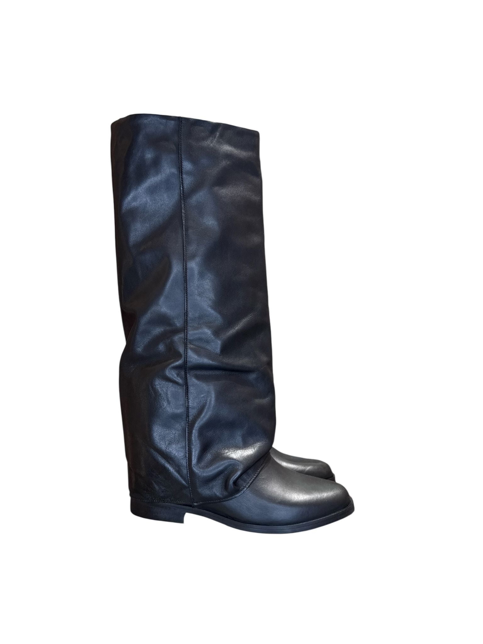 Stivali in pelle nero. Risvolto in pelle. Modello tubolare. Rialzo interno di circa 5 cm