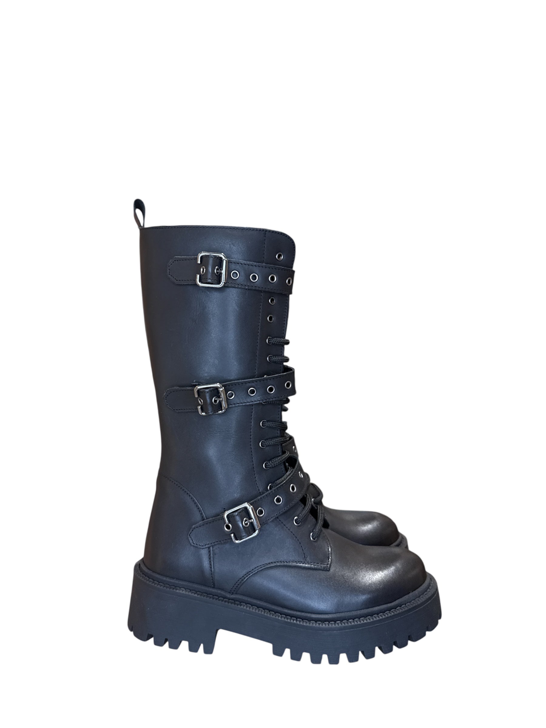 Stivali in pelle nero, modella anfibio. Presenta cinturini sul gambale e zip interno piede
