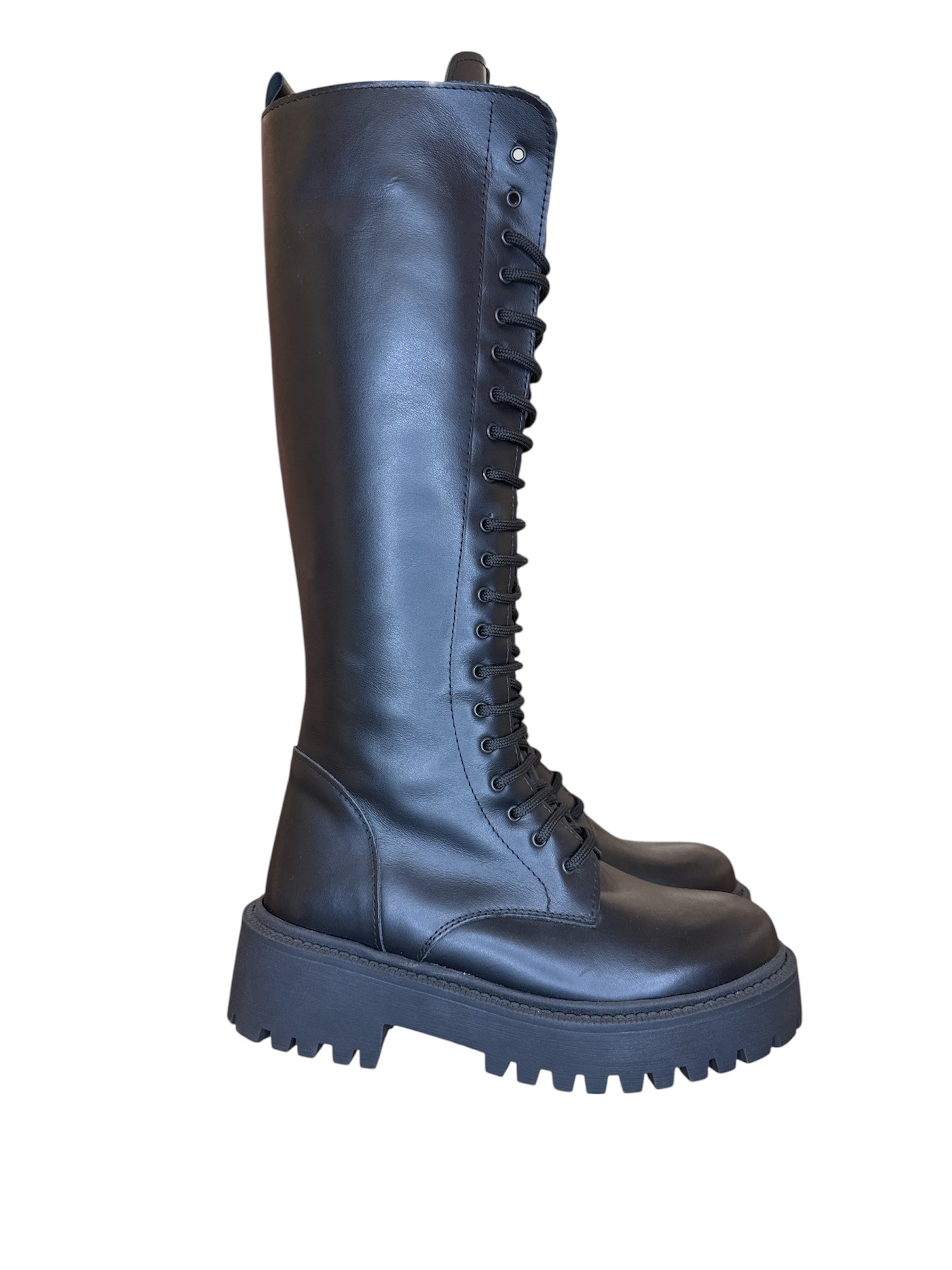 Stivali in pelle nero, modello anfibio. Presenta zip interno piede. Fondo in gomma