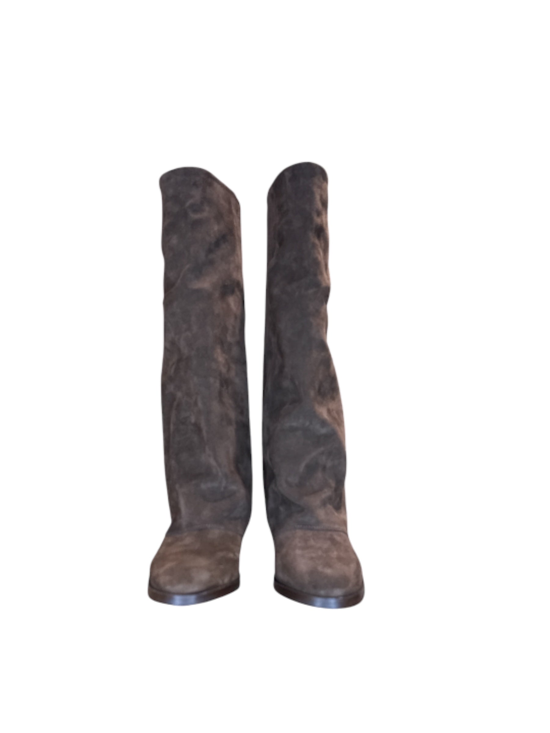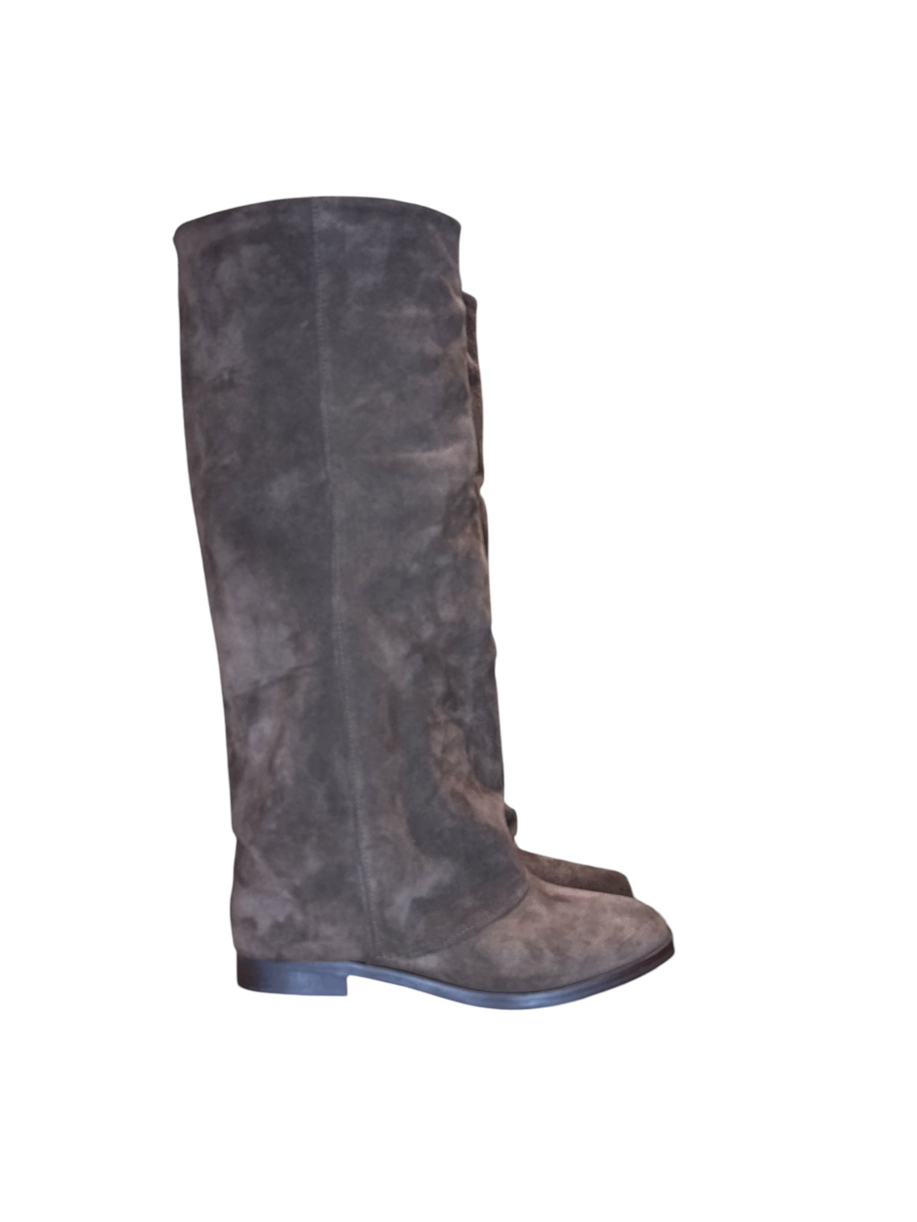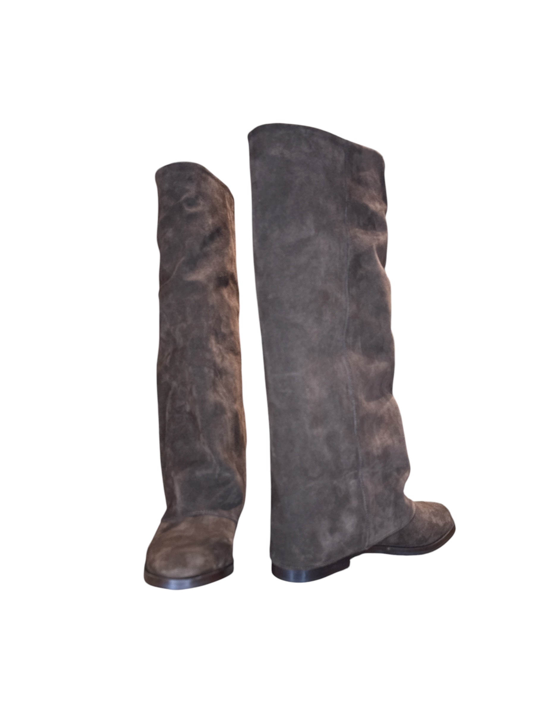 Stivali con piegono camoscio marrone. Rialzo interno alto circa 5/6 cm